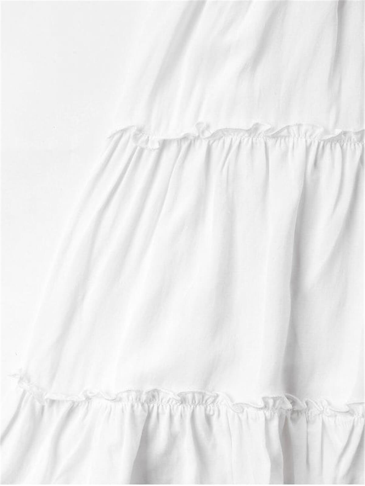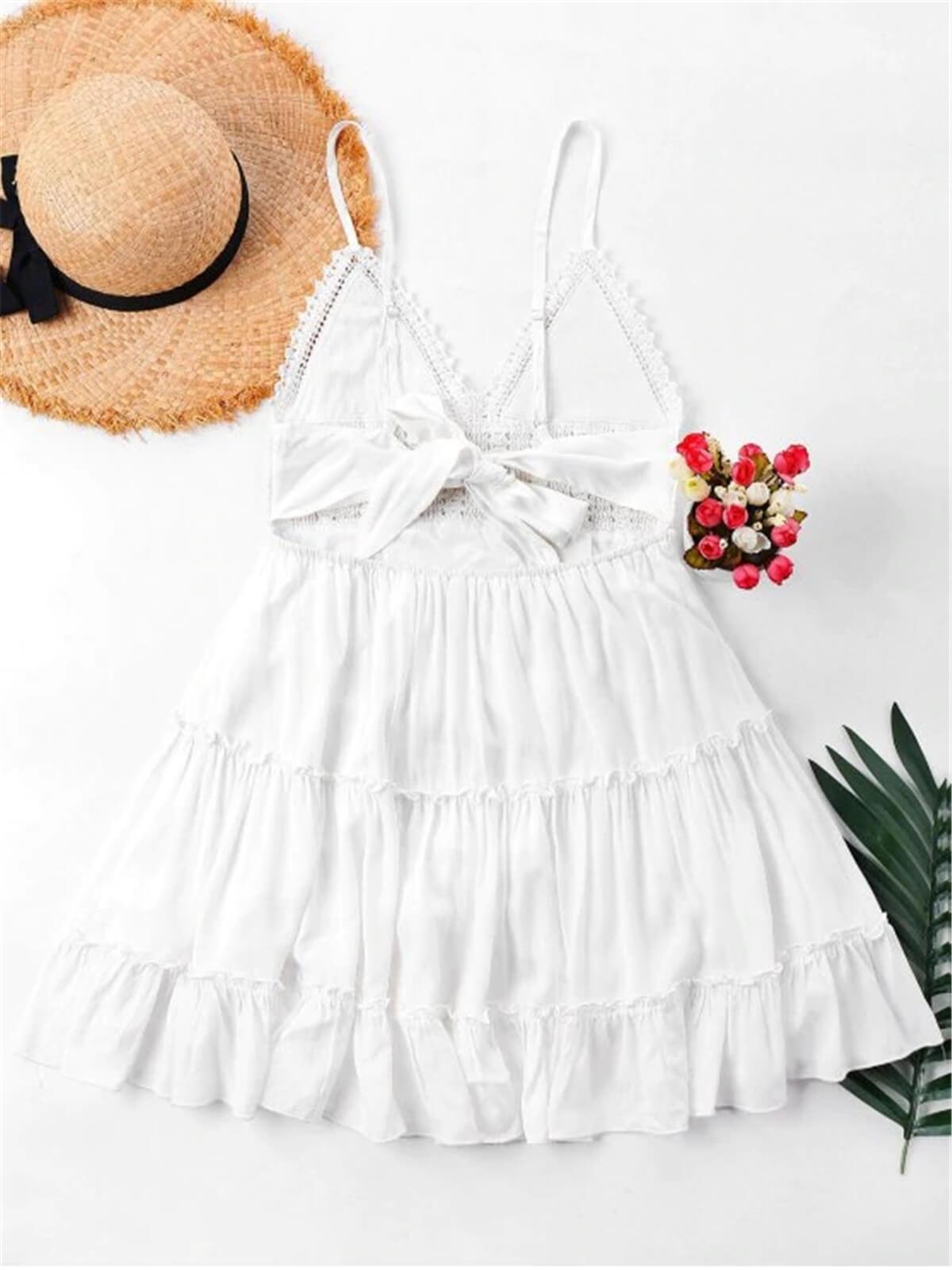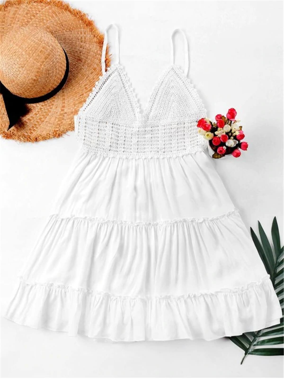 The perfect dress for your summer adventures is here! Patched with delicate crochet and trimmed with ruffles, this mini cami dress with a flared silhouette emphasizes a flattering high waistline and pretty knotted back detail. It looks best when paired with sandals to walk on the beach for a relaxing day.