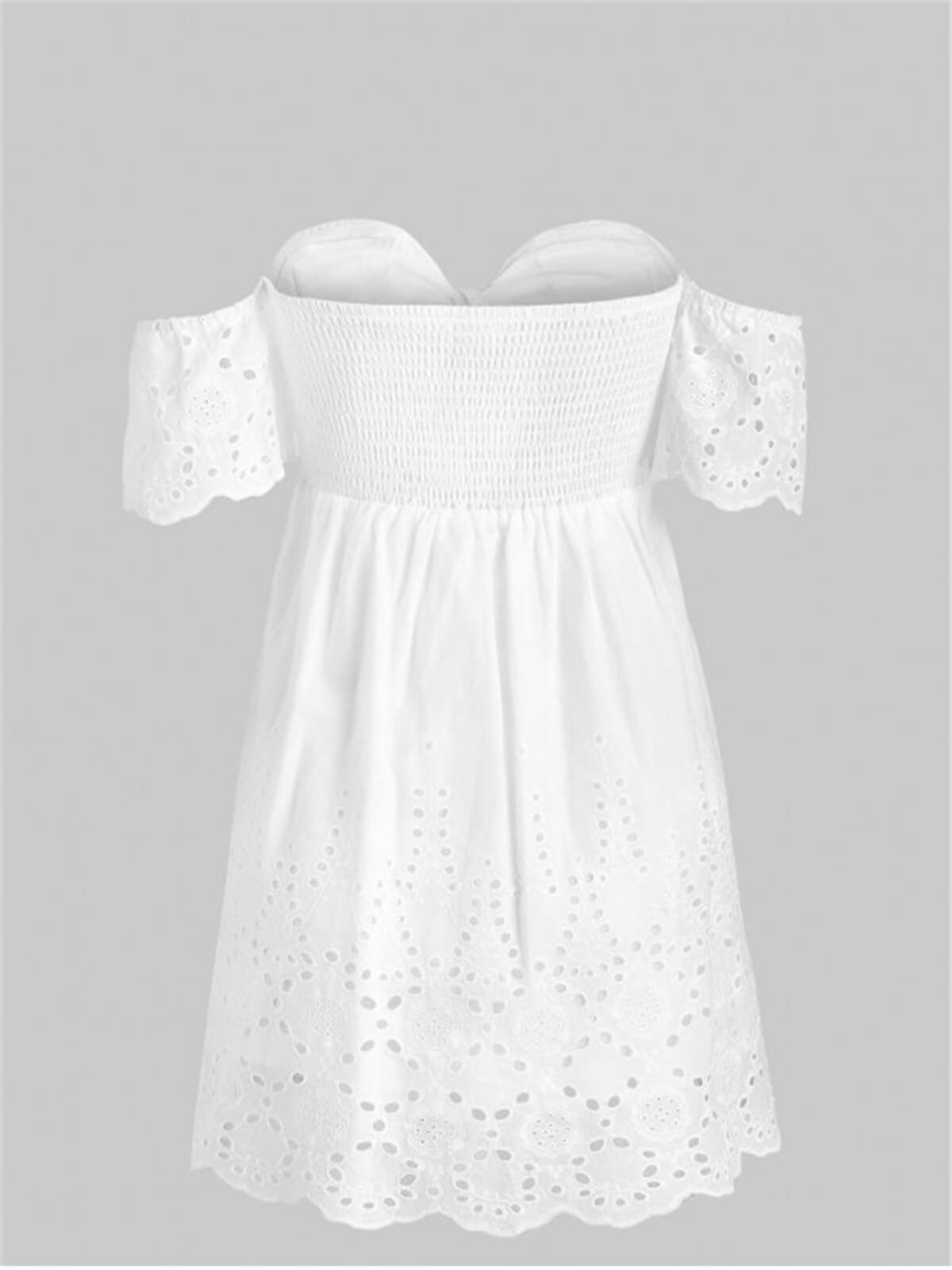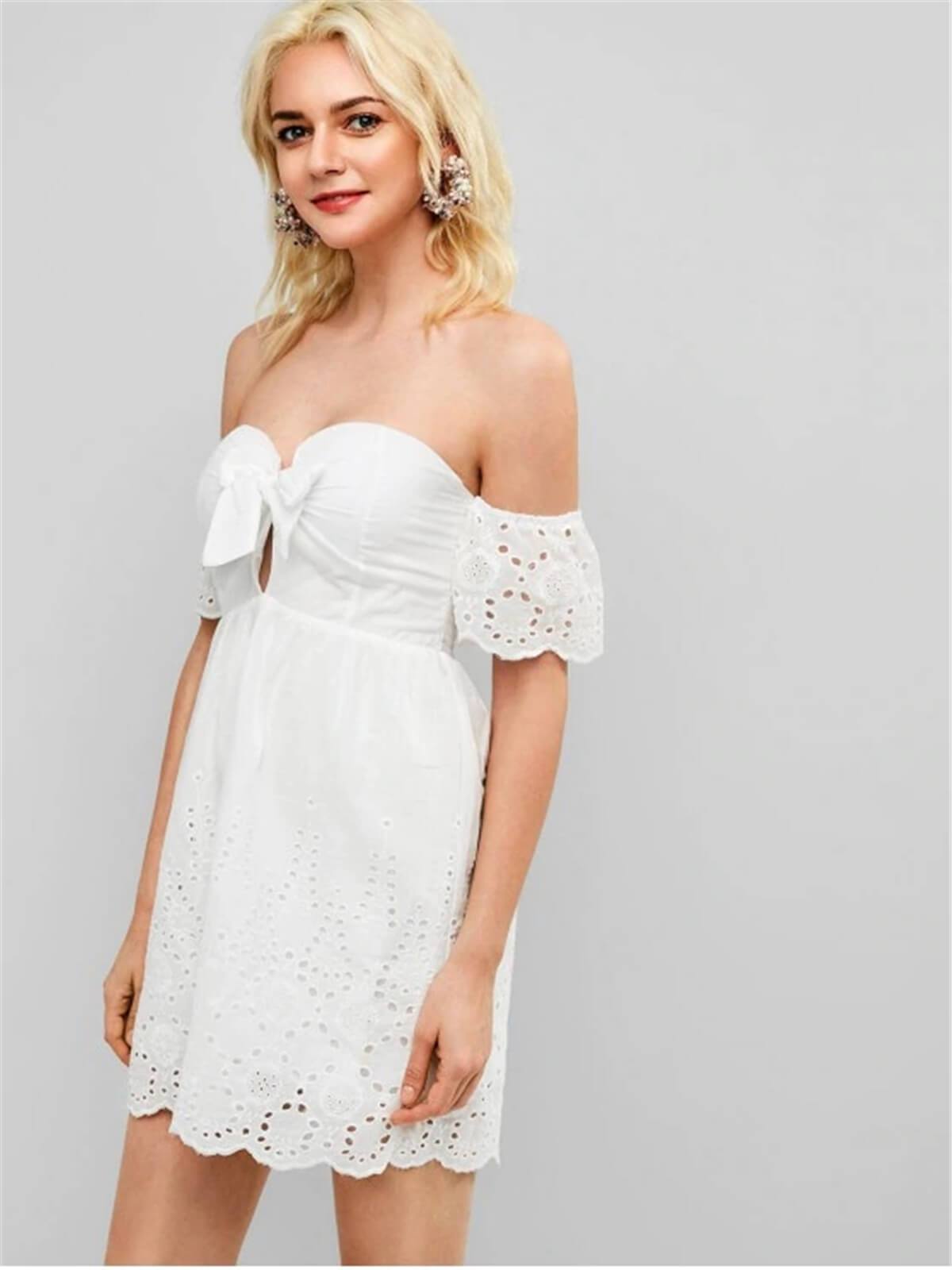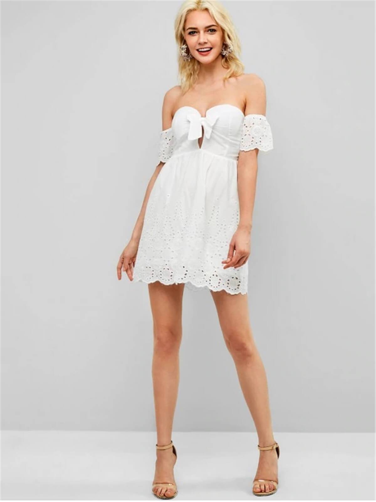 Sweet in pure white, this mini eyelet dress was made to show off your charm. A flirty bandeau collar highlights your beautiful shoulder and the front knot adds much fun. Padded cups provide enough support and help to shape the bust. And the smocked fabric at back is of great elastance that can make for a suitable fit for the curves. It's a perfect dress for the upcoming vacation days.