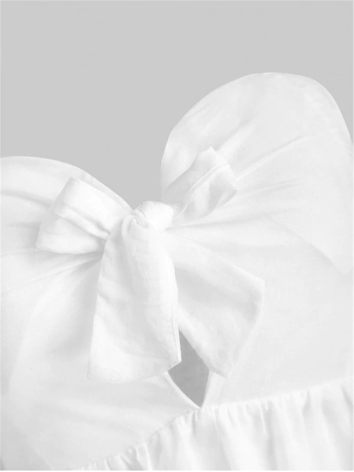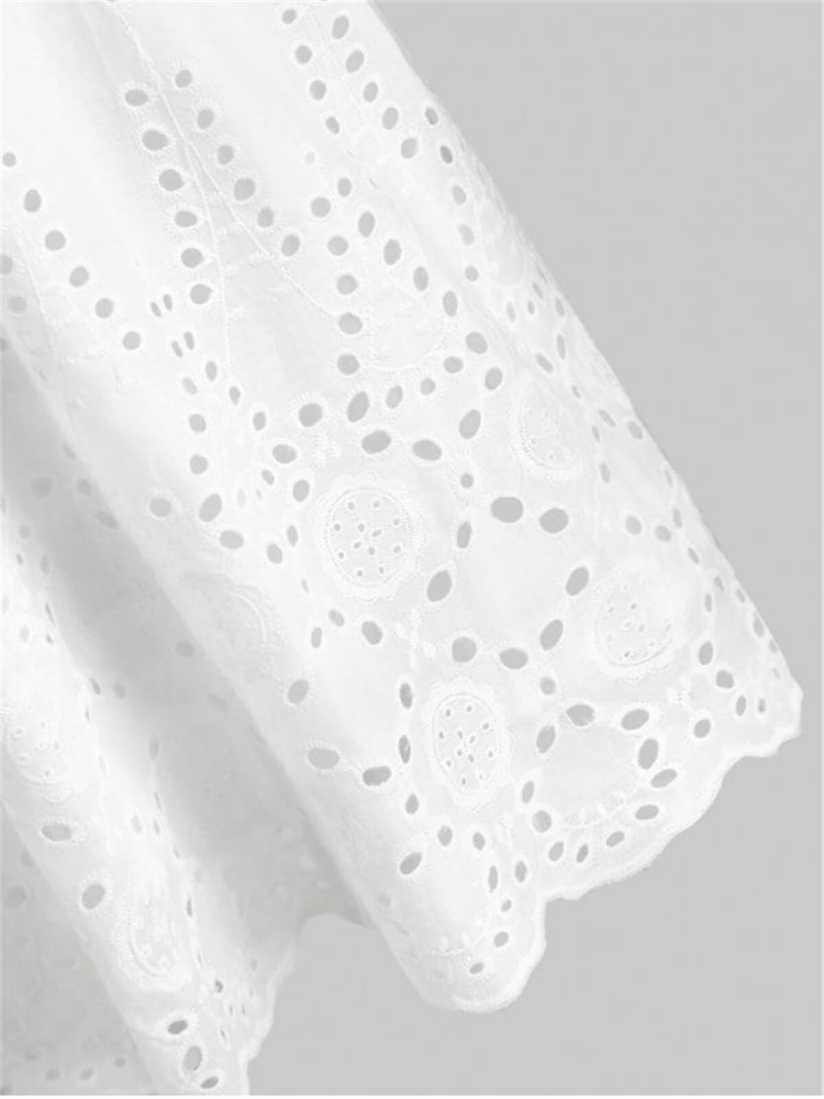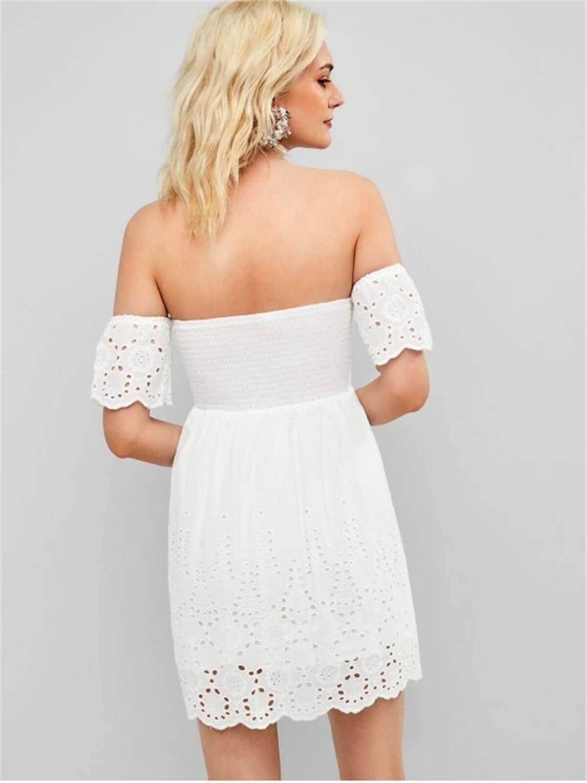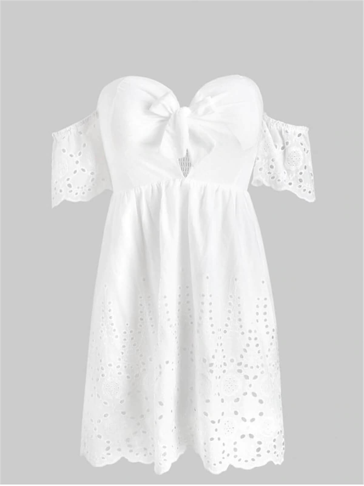 Sweet in pure white, this mini eyelet dress was made to show off your charm. A flirty bandeau collar highlights your beautiful shoulder and the front knot adds much fun. Padded cups provide enough support and help to shape the bust. And the smocked fabric at back is of great elastance that can make for a suitable fit for the curves. It's a perfect dress for the upcoming vacation days.