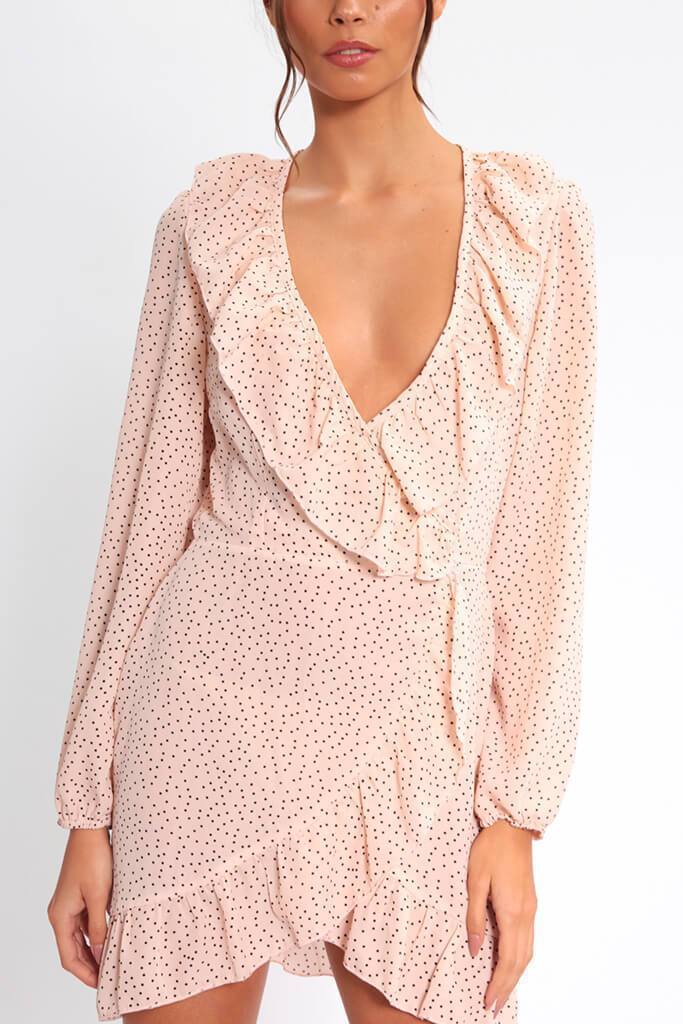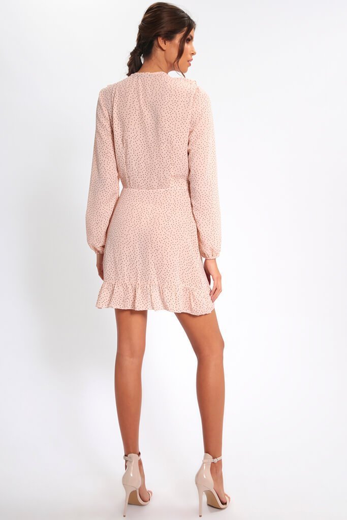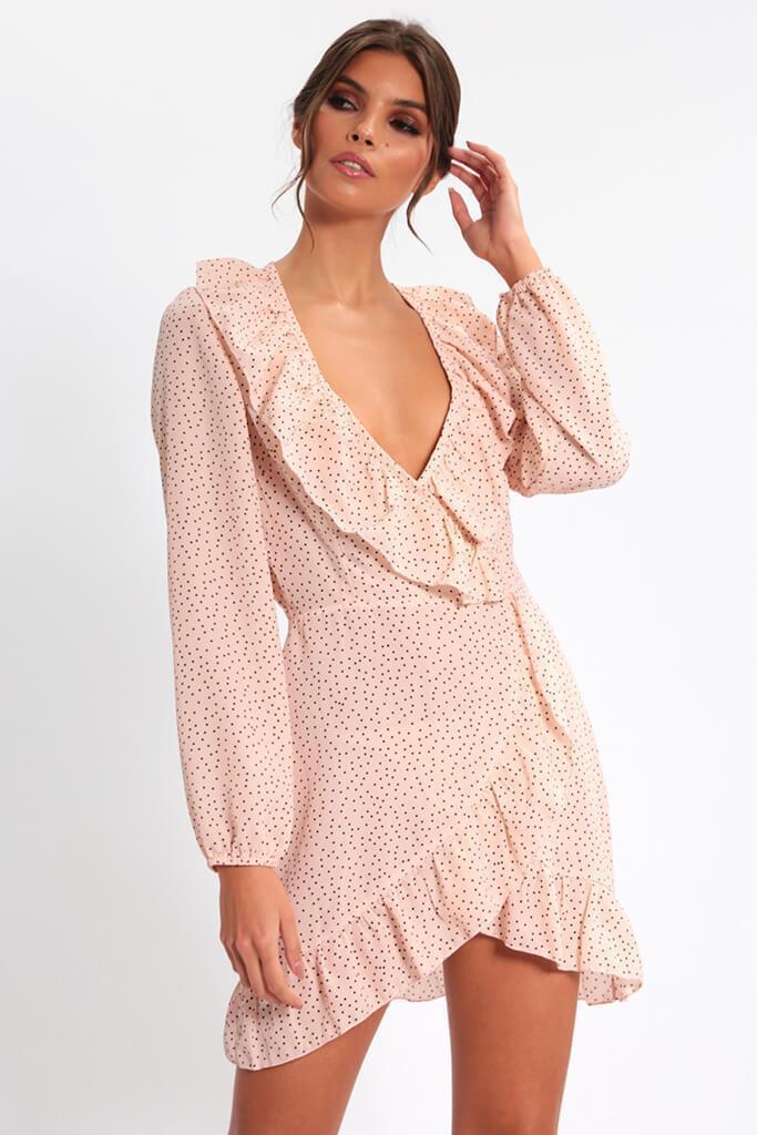 Pink with black polka dot print tea dress in a mini length. Features long sleeves, wrap front neckline and ruffle trim.
