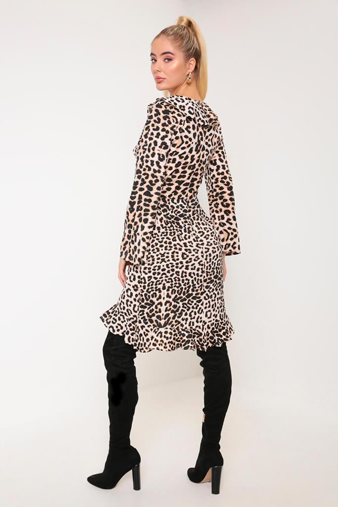 Leopard print tea dress with frill detailing, wrap over front and long sleeves.