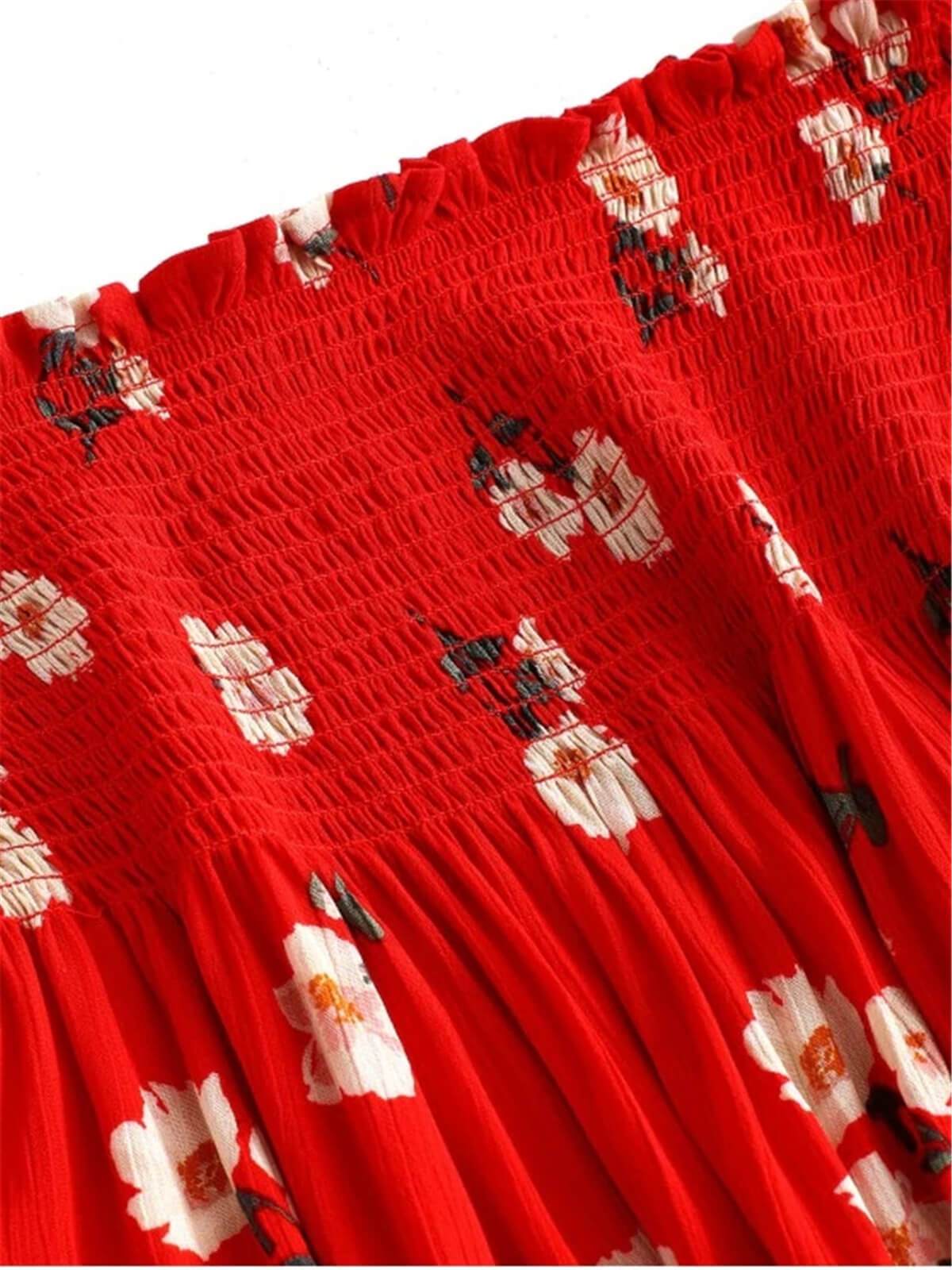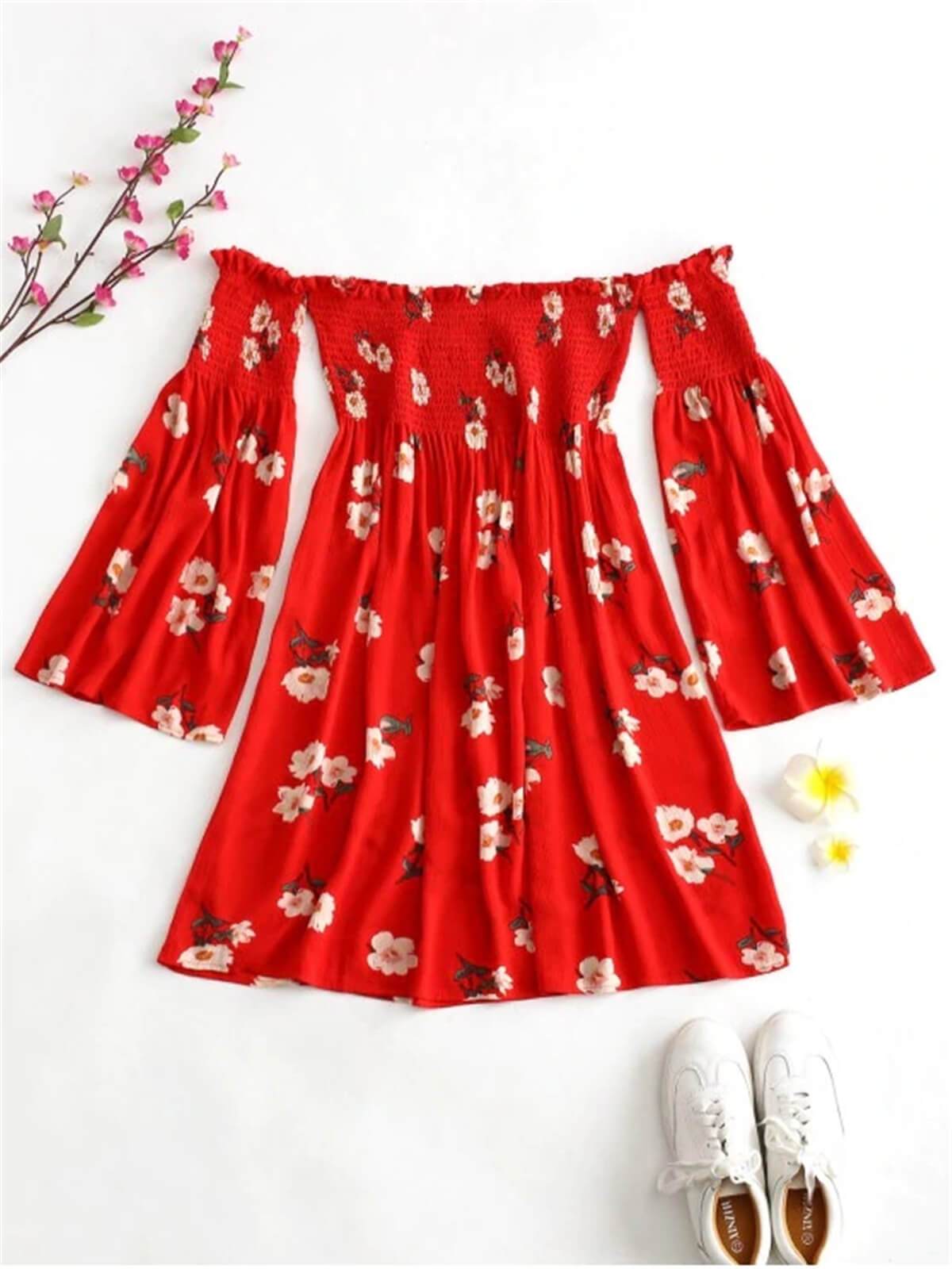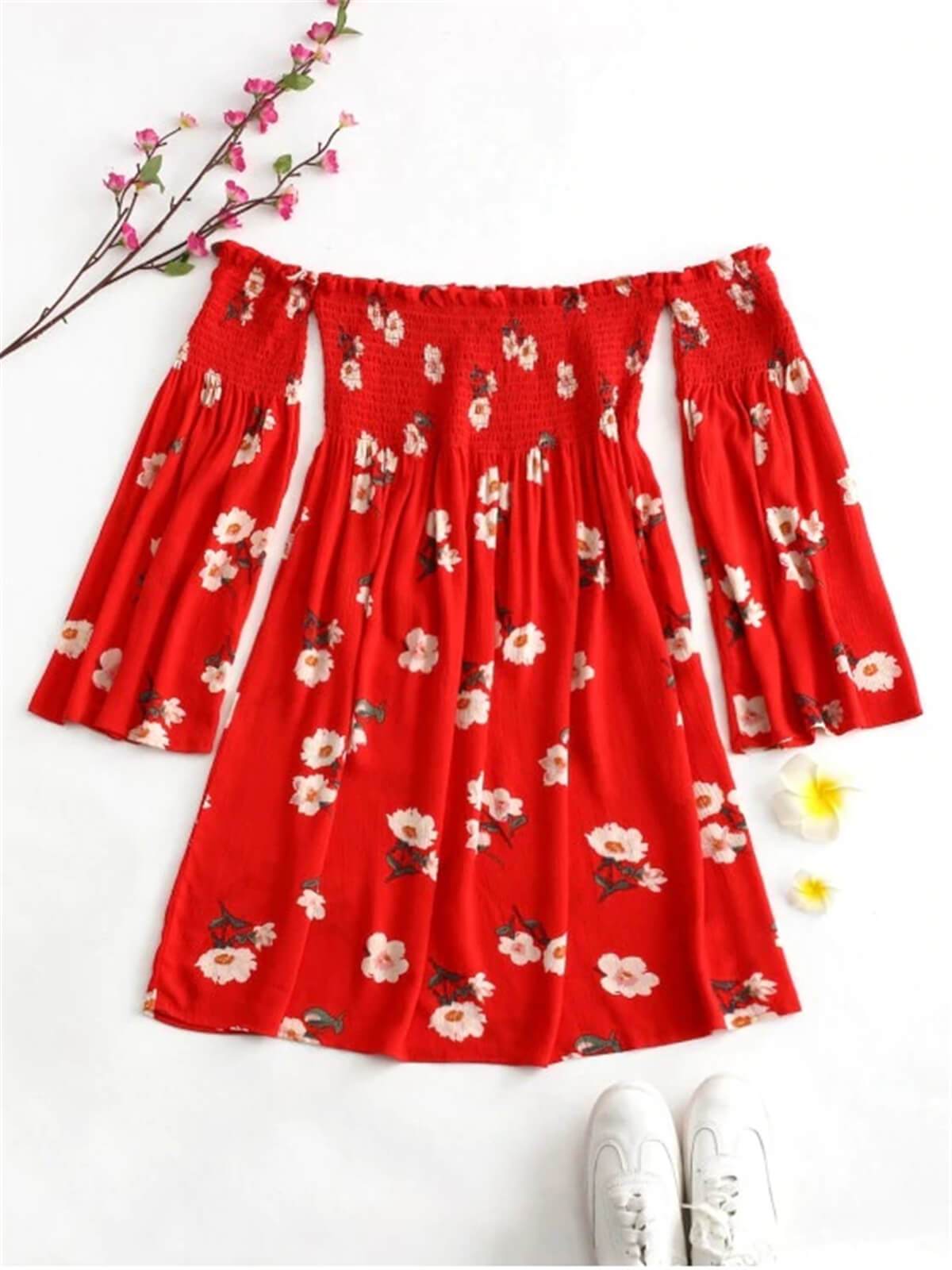 Flirty and pretty, this mini floral dress is flattering with the off-the-shoulder collarline for a little flirt and edgy with the smocked bodice for a stretchy touch, which is ended with the long flared sleeves. It is the adorable A-line style that you will love at first sight.