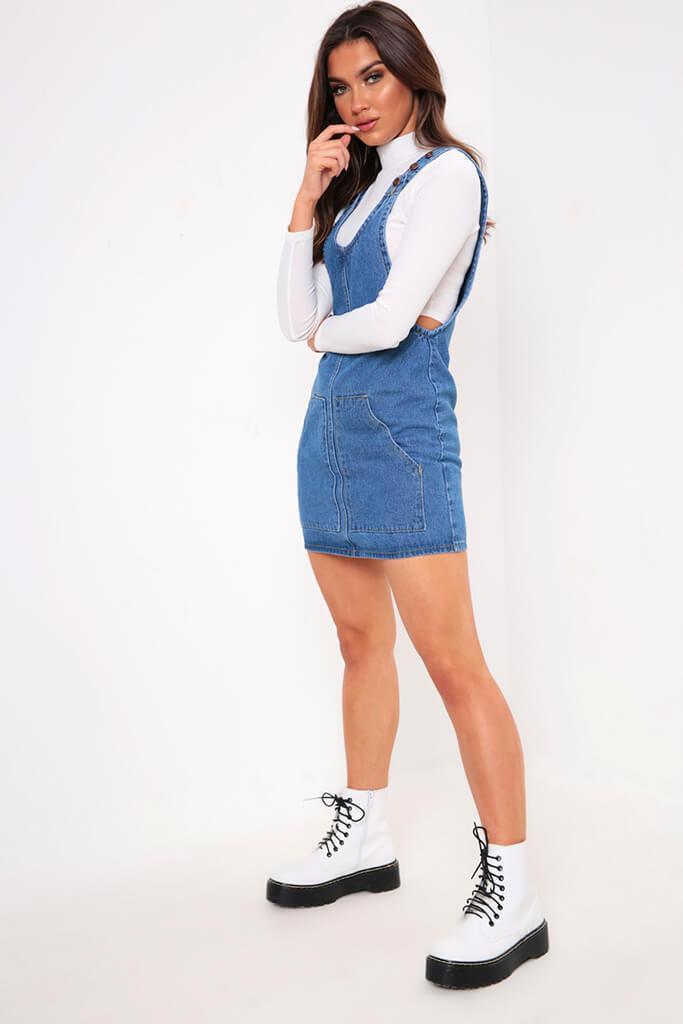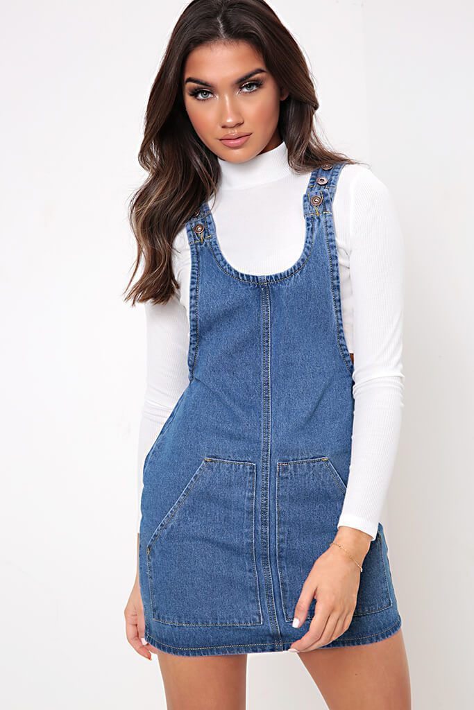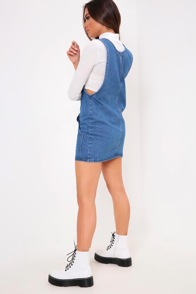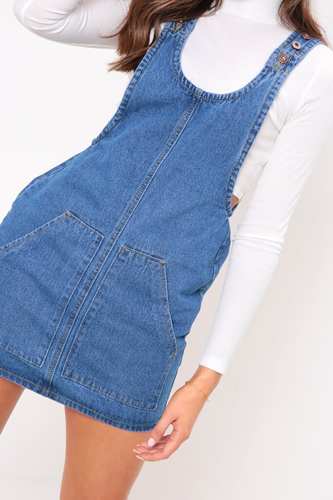 Mid wash denim pinafore dress in a slim fit with front utility style pockets and scoop neck.