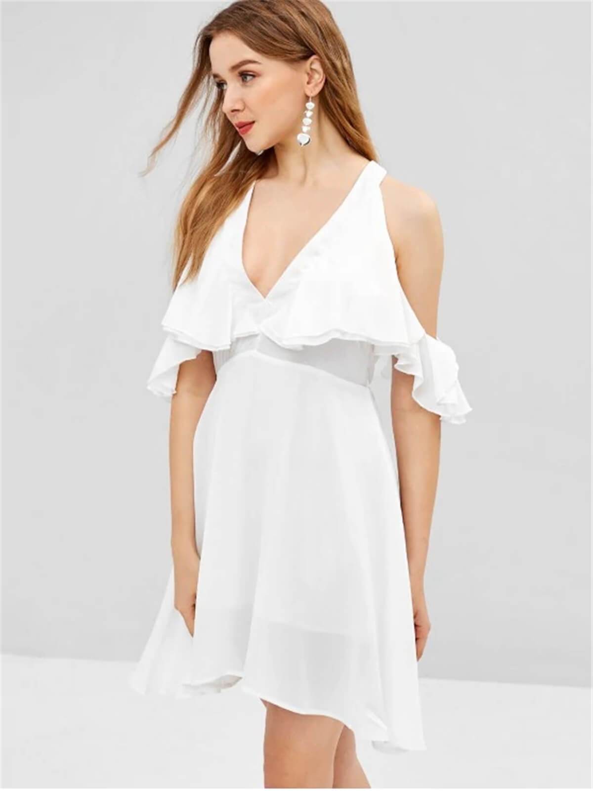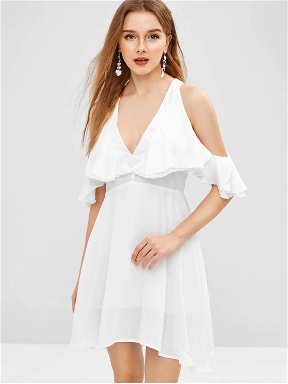 V Neck Cold Shoulder Mini Dress - Milk White M